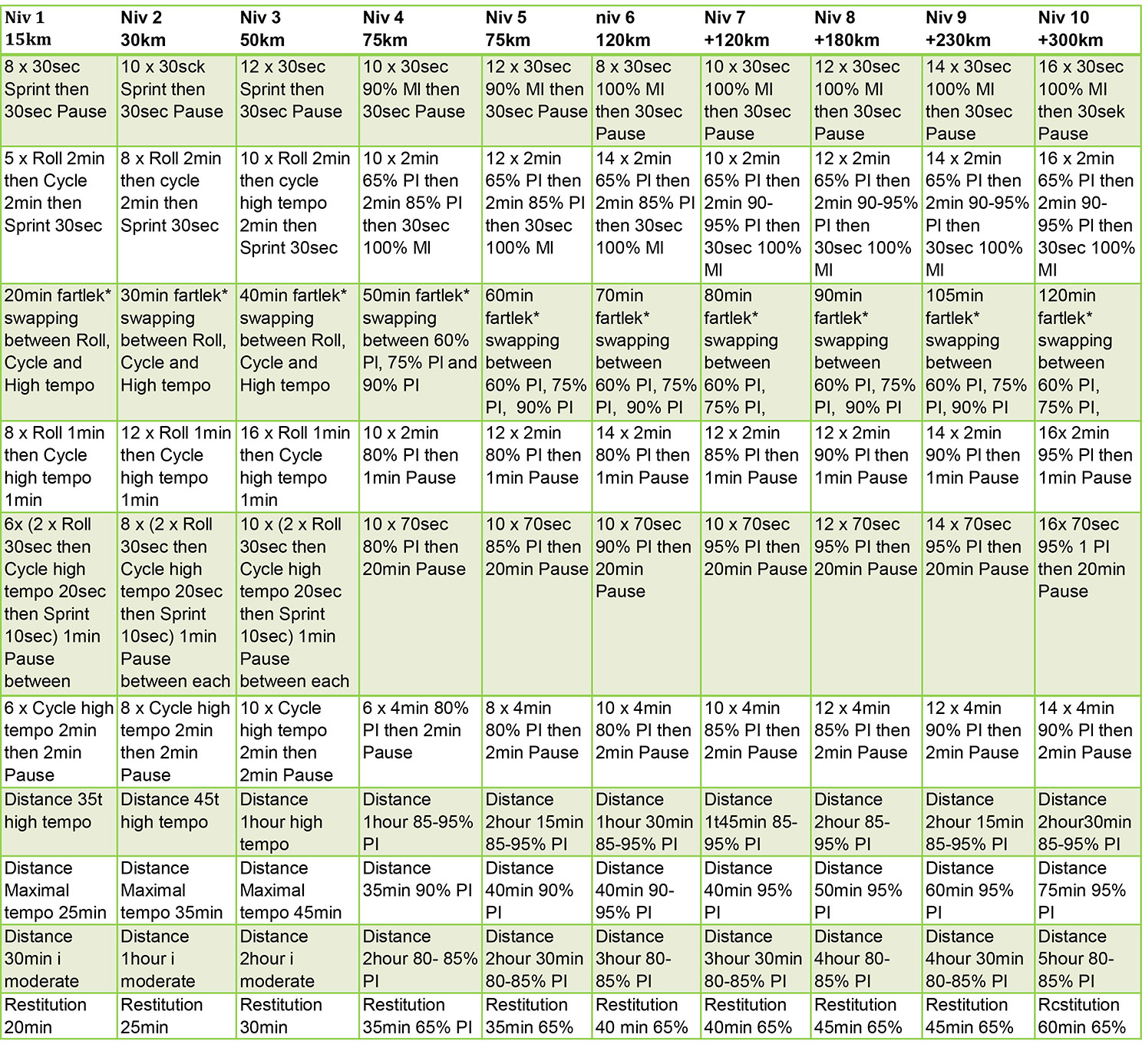 - (x)km= If you can cycle x km without a break, you should start at that level.