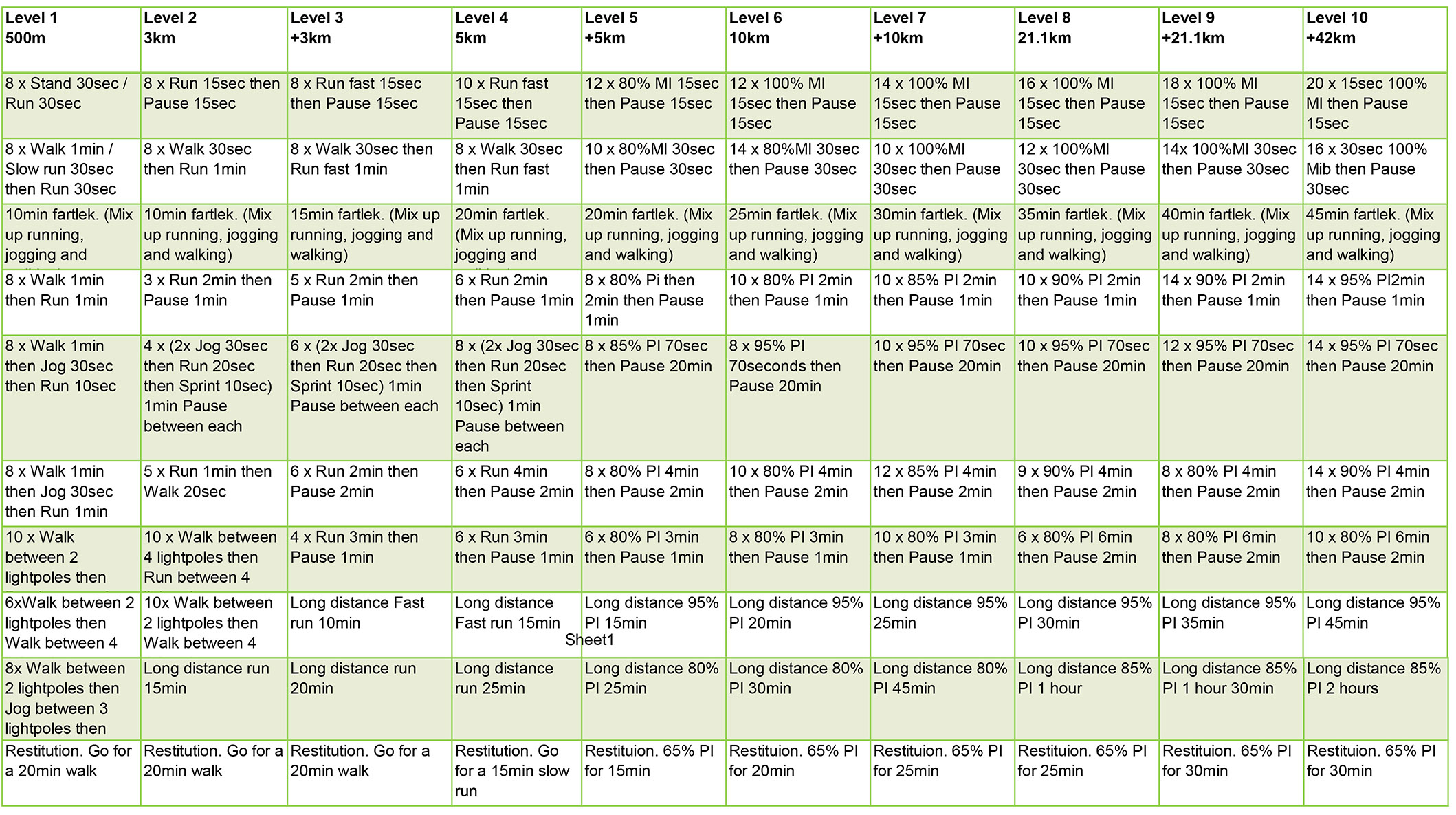 - Level (x) km = If you can run x km without pause you should start at that level.