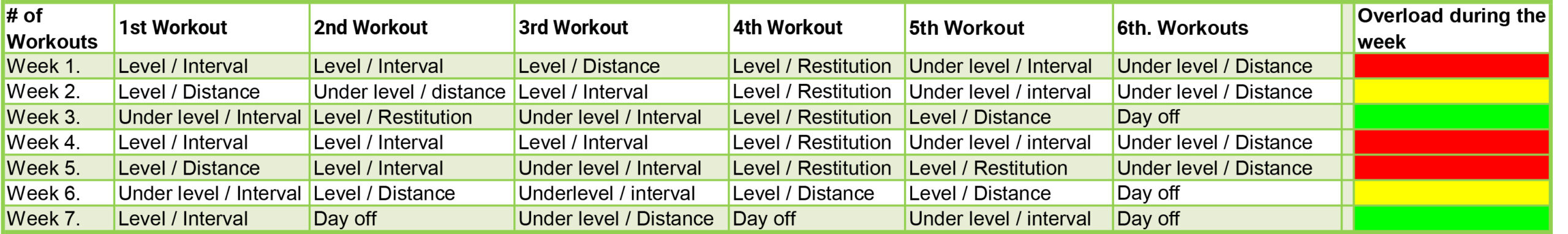 - 7 week cycle as a guide to exercise load. Aside from this you must add injury prevention and performance-optimizing training, regardless of level.