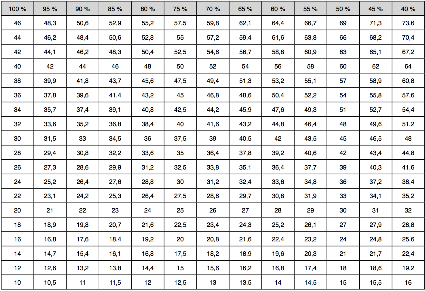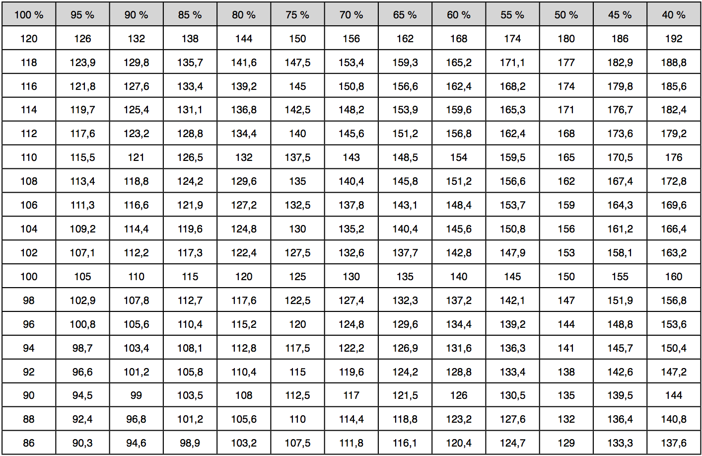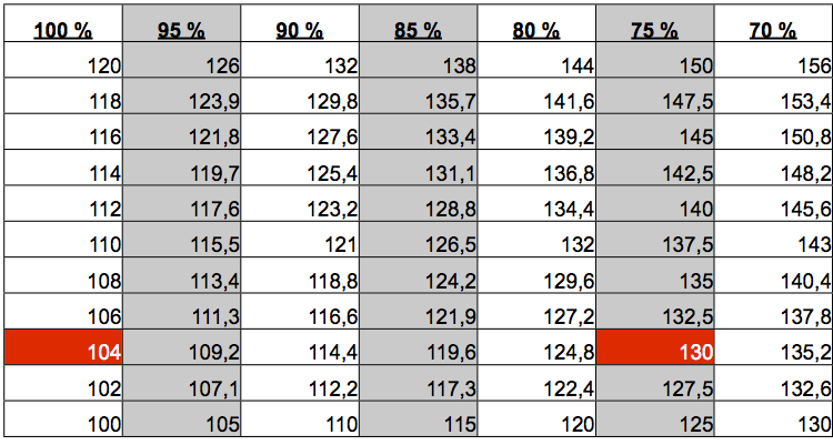 Look below 100% and find it approx. time you completed the all out test on for random example; 104. Then go out horizontally in the form until you are below the% rate you want to train with ex. 75%, read your time = 130 sec. is thus the interval time you have to train with, at 75% load.