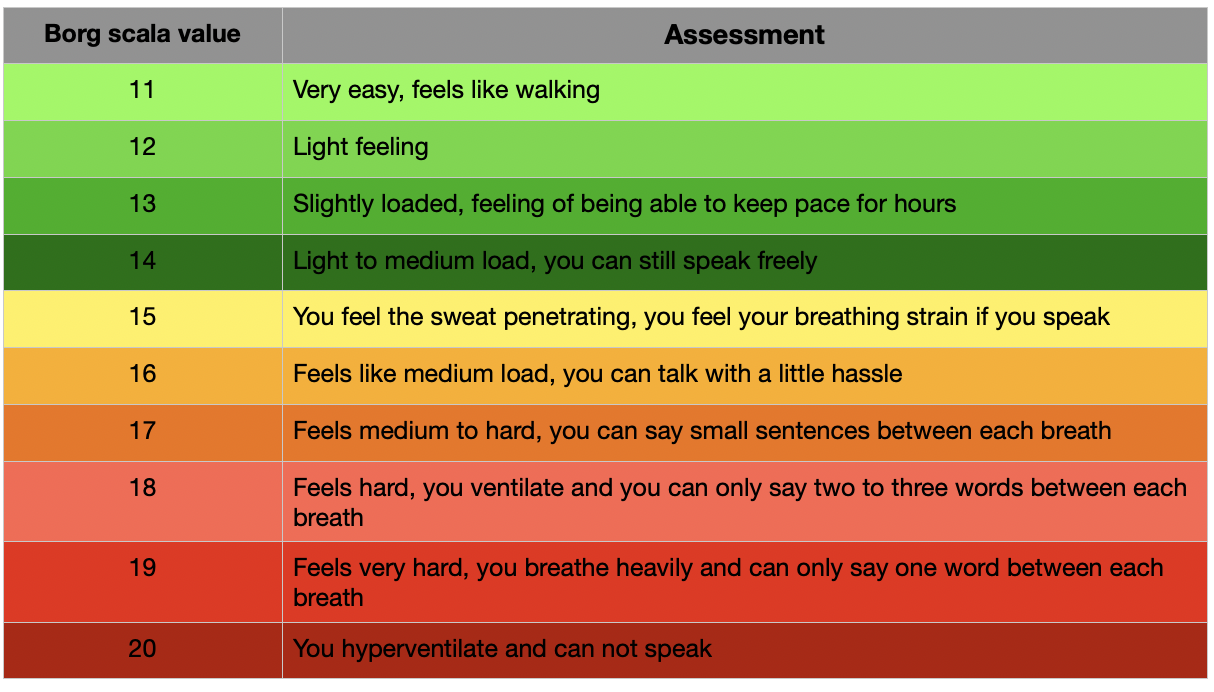 Use of heart rate: Exercise in the range 70-100% of the heart rate reserve = (work heart rate-resting heart rate/max heart rate resting heart rate) = intensity in% or, (max heart rate-resting heart rate x desired work% + (resting heart rate)) = work heart rate. Do you have problems exercising while using the heart rate, since you can not find the heart rate on the wrist or neck. Or you find it complicated and do not have a heart rate monitor. Then you can make use of borg’s scale, which is a subjective assessment of your own load, measured on breathing, speech and emotions, see chart below: