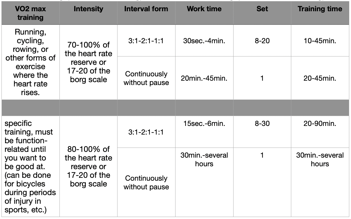 - The form of exercise should always be weighted before other forms of exercise as it builds up VO2 max training Intensity Interval form Work time Set Training time Running, cycling, rowing, or other forms of exercise where the heart rate rises. 70-100% of the heart rate reserve or 17-20 of the borg scale